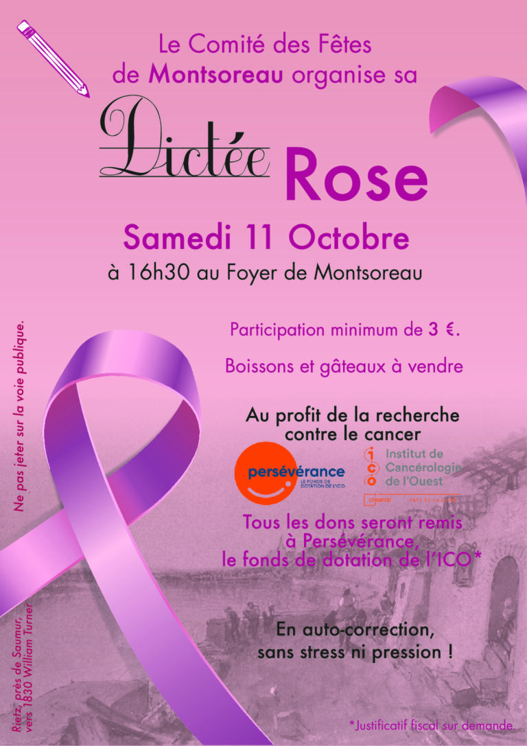 Le Comité des Fêtes de Montsoreau organise sa dictée rose le samedi 11 octobre à 16h30 au foyer de Montsoreau.